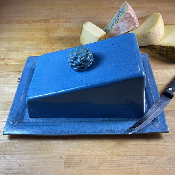 Meine neueste Servierglockenkreation: eine Käseglocke. Natürlich im passenden Kühlschrankformat. Diese Käseglocke kann mit der kleinen, mittleren und großen Servierglocke gut kombiniert werden. Die kräftige blaue Glasur bricht sich in einem dezenten Grünton an den Kanten. Du kannst es sehr schön an dem Knauf sehen, der durch das Farbenspiel die Blütenform sehr schön unterstreicht.