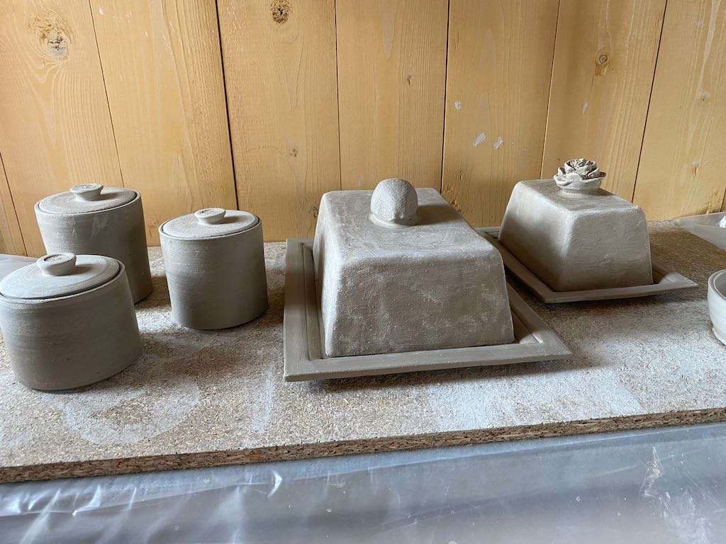 Meine Spezialität sind aktuell vor allem Gefäße mit Deckel: Dosen aller Größen – Butterdosen, Vorratsdosen, Teedosen, oder was einem noch so in den Sinn kommt, wo ein Deckel drauf soll – und meine schönen wie praktischen Servierglocken. Alle meine Gefäße und ihre Deckel werden aus Ton hergestellt und sie sollen nicht nur gut aussehen, sondern sie sind auch alle im praktischen Einsatz erprobt. So passen z.B. meine Servierglocken in allen Kombinationen perfekt in den Kühlschrank – endlich kann auf die Frischhaltefolie verzichtet werden und alles wird auf einer schönen Keramikplatte angerichtet unter der passenden Haube frisch gehalten. Aber bitte, sieh es dir doch selbst einmal an.