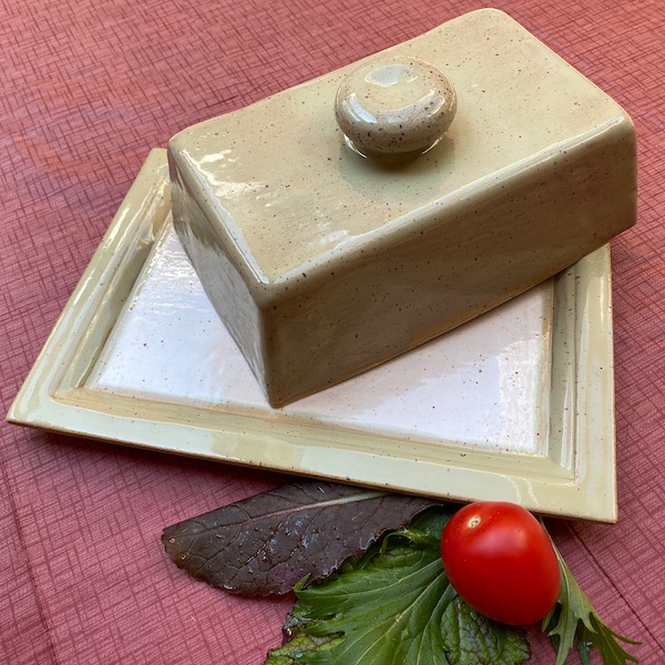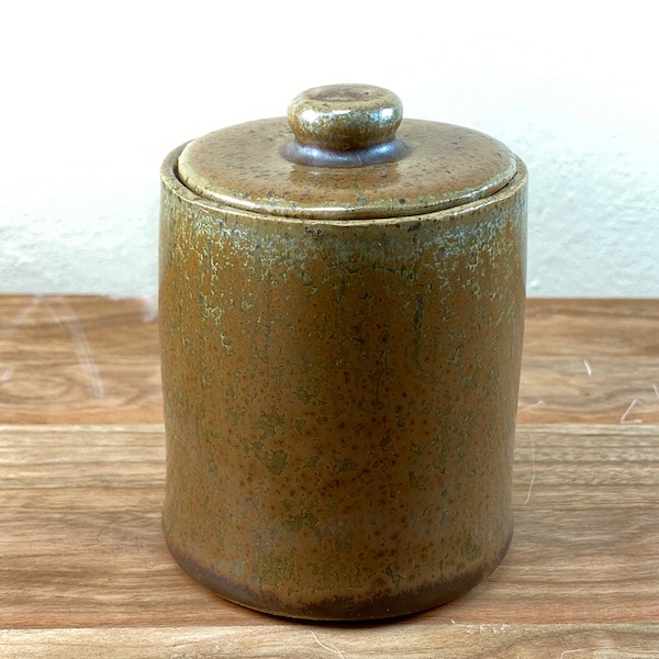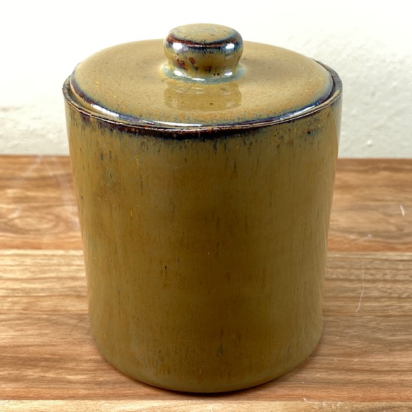 Olivine ist eine Glasur, die gedeckte Grün- und Brauntöne erzeugt. Dort wo die Glasurschicht dicker ausfällt, wird ein schöner metallisch grüner, fast spiegelartiger Glanz erzeugt. Dies kannst du schön am oberen Rand der Dose erkennen.