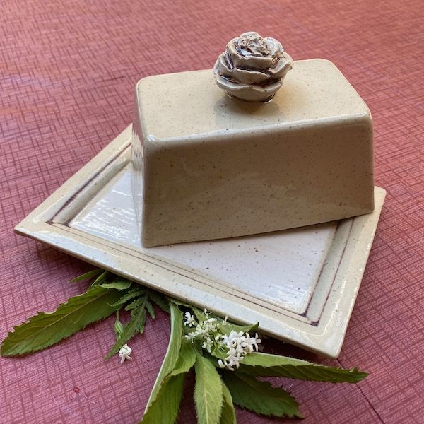 Die Oberfläche Oxblood ist eine milchig glänzende und transparente Glasur. Dort wo sie dick aufgetragen ist, zeigt sie ihre roten Variationen. Du kannst das gut am Blütengriff und an den Kanten der Servierplatte beobachten. Diese Glasur ist eine meiner Lieblingsglasuren und passt sehr gut in jede Küche. Besondere Aufmerksamkeit verdient der aus Ton geformte Blütenkopf. Dieser gibt der Servierglocke einen lieblichen und frischen Charakter.